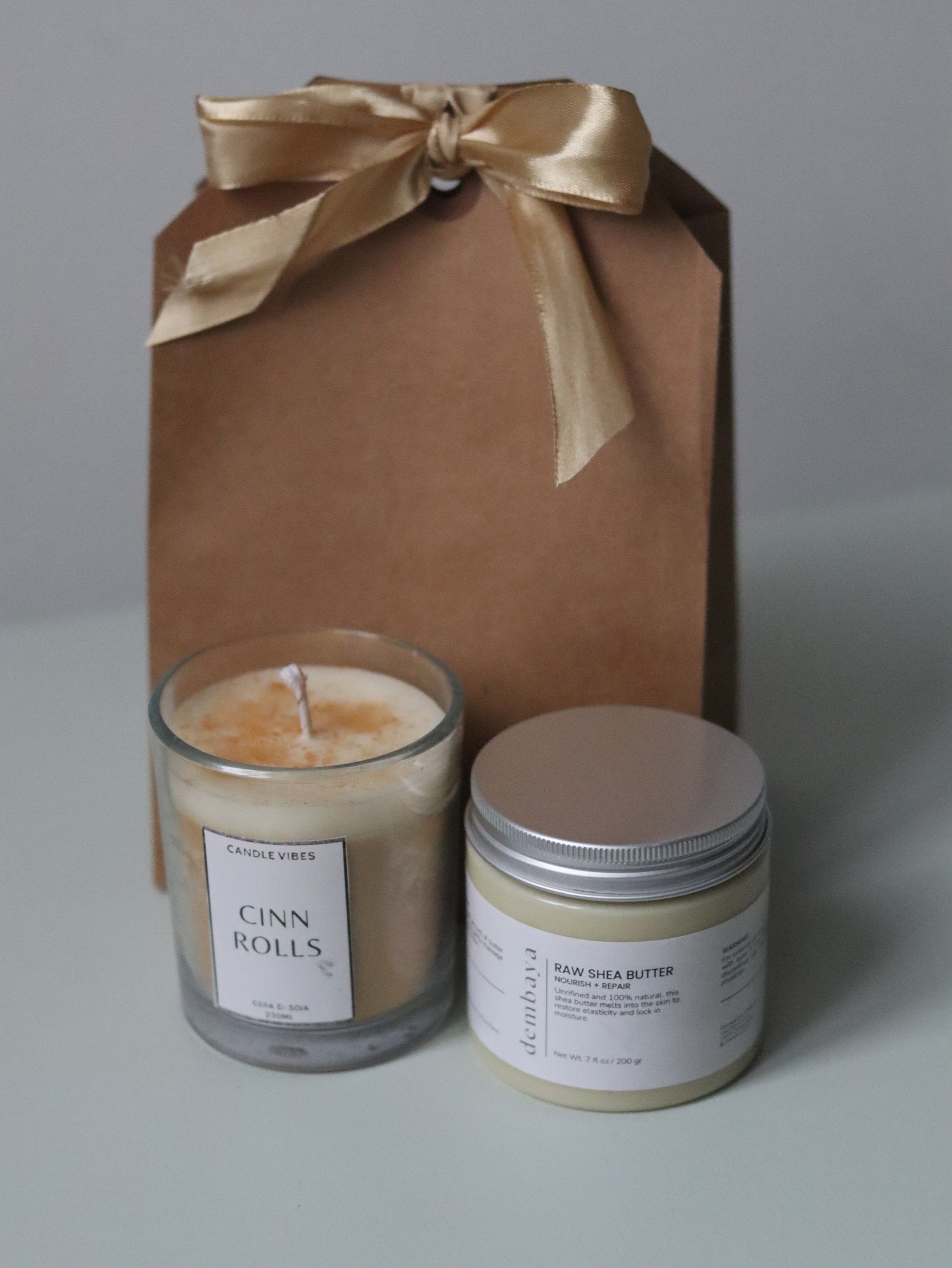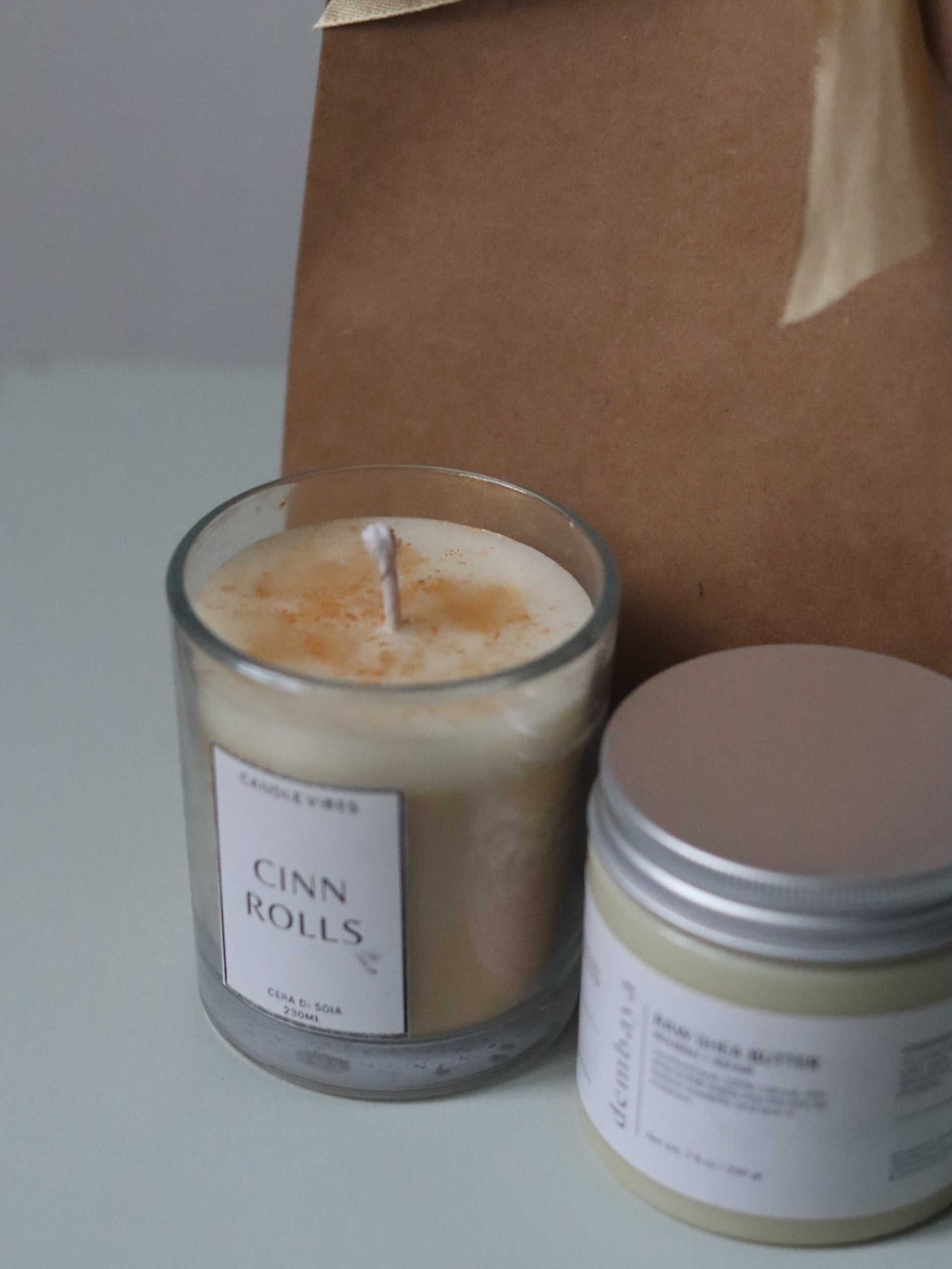 All’interno trovi il nostro Burro di Karité grezzo 100% naturale, ideale per proteggere e rigenerare la pelle, insieme alla candela artigianale Cinnamon Rolls firmata Candle Vibess: una fragranza golosa e speziata che profuma la casa come un dolce appena sfornato.